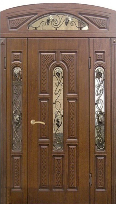 Поскольку в большинстве случаев устанавливаемые на входе в коттедж двустворчатые двери являются еще и предметом интерьера, украшающим здание, их дизайну предается особое значение. Эти двери, как правило, отделываются атмосферостойким МДФ, натуральным шпоном, массивом. Эффектно на таких дверях смотрится витражный узор, применение ковки, зеркальных элементов. Вариантов декора входной двустворчатой двери масса, тут все зависит от пожеланий заказчика.
